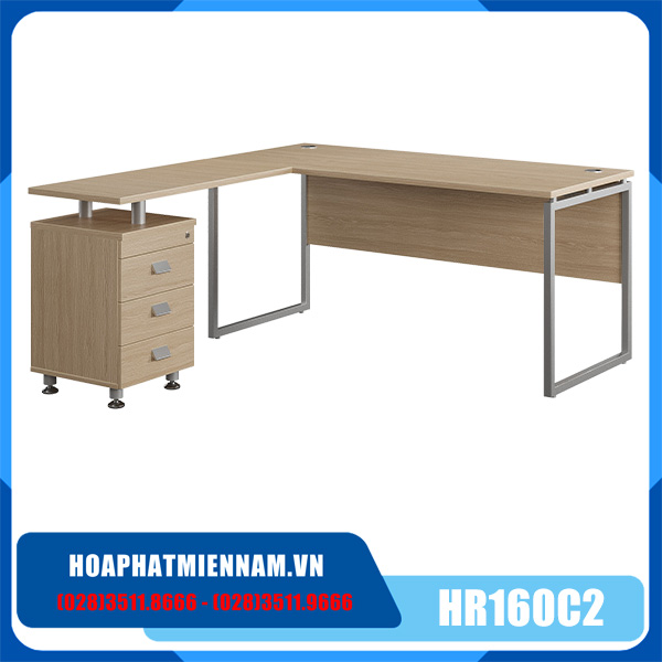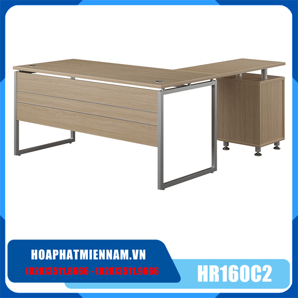 Bàn lãnh đạo Hòa Phát HR160C2 mặt chữ L sử dụng gỗ công nghiệp Melamine kết hợp yếm gỗ và khung chân ống thép hộp sơn tĩnh điện. Sản phẩm bàn HR160C2 trang bị một hộc ngăn kéo đi kèm liền với chân.