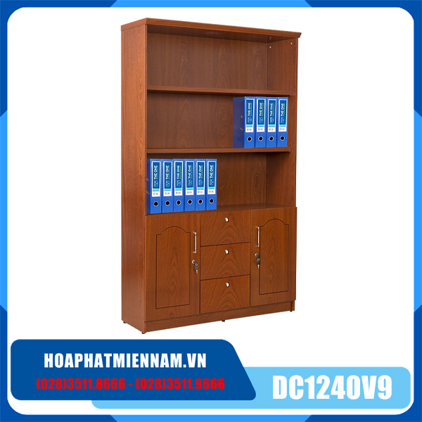 Tủ tài liệu Hòa Phát DC1240V9 dạng 3 buồng sử dụng gỗ công nghiệp Veneer. Thiết kế tủ sở hữu khoang trên trống với 2 đợ kệ, bên dưới có hai khoang tủ cánh mở và 3 ngăn kéo.