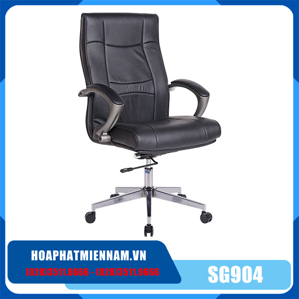 - Thẩm mỹ sang trọng: Ghế ngồi làm việc bọc da SG904 với chân thép mạ và tay nhựa sơn nhũ bạc hoặc nhũ đồng tạo nên vẻ ngoài tinh tế, phù hợp với không gian lãnh đạo hoặc văn phòng chuyên nghiệp.